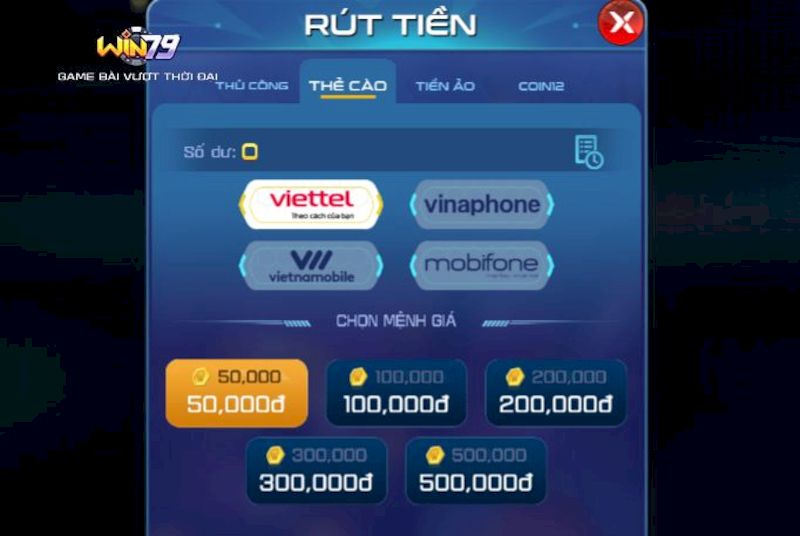 Nếu không có tài khoản ngân hàng hoặc muốn rút tiền bằng phương thức khác, người chơi hoàn toàn có thể chọn phương thức rút tiền qua thẻ cào. Hình thức này được thiết kế nhằm phục vụ những ai chưa có tài khoản ngân hàng hoặc muốn sử dụng tiền ngay lập tức qua thẻ nạp điện thoại.- Bước 1: Đăng nhập vào tài khoản Win79 và chọn “Rút tiền” tương tự như khi rút qua ngân hàng.