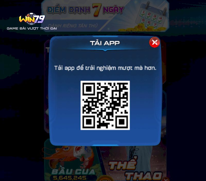 - Bước 3: Màn hình sẽ hiển thị mã QR để người chơi có thể quét. Việc quét mã QR này sẽ dẫn bet thủ đến trang tải app Win79 phù hợp với thiết bị di động đang sử dụng.